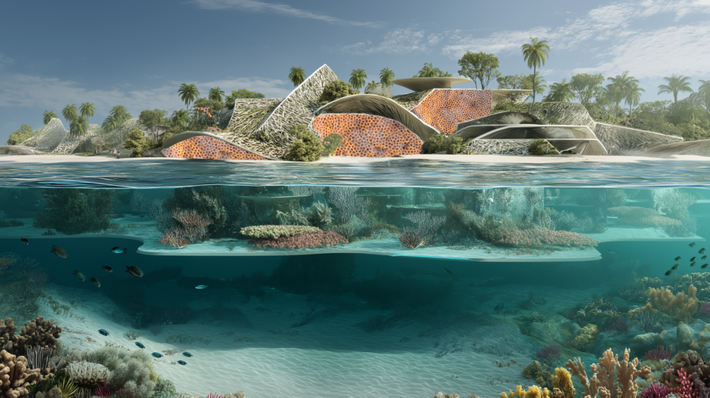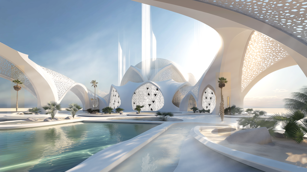 • The Coral Wall: rooted in the historic use of coral stone in the UAE coastal architecture, reimagined as a living form of architecture embodying memory, resilience and regeneration, bridging sea and land.